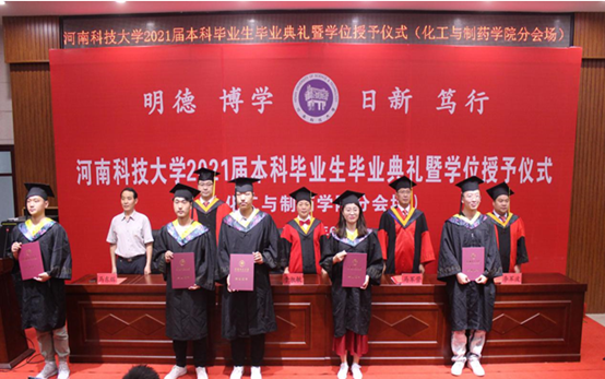 领导分别为2021届本科毕业生代表颁发毕业证书。院党委书记于淑敏、院长马军营、副院长魏学锋、李军波为获得学士学位的毕业生正冠拨苏,授予学位,并合影留念。接着,2021届毕业生孙长同学和李静同学作为毕业生代表发言,表达了对母校的感激,对老师和同学的感谢和不舍以及对未来美好生活的憧憬。化工系主任段永华老师和制药系主任王新胜老师作为教师代表发言,对毕业生表达了殷切希望和美好祝愿。最后,院长马军营进行总结讲话,马院长对2017级毕业生取得的成绩给予了肯定,并向同学们作出以下嘱托:一是诚信做人,矢志修身。希望毕业生们坚持矢志修身,不要被事业发展中遇到的困难所动摇,不做功名的奴隶,不做欲望的俘虏,要以开阔的胸襟面对事业的坎坷,以豁达的态度看待人生的挫折,经受住岗位环境的历练,做一名行稳致远、德才兼备的化工人。二是终生学习,求索实践。要不断完善自我,充实自我,超越自我,才能满足未来事业发展的需要,才能在求索实践中实现国家的梦想和个人的人生价值。三是不忘初心,担当使命。希望毕业生们把个人理想融入国家和民族的事业中,肩负起时代赋予的历史责任,在激情奋斗中,绽放青春的光彩。在庄严的河南科技大学校歌中,2021届本科生毕业典礼暨学位授予仪式圆满落幕。